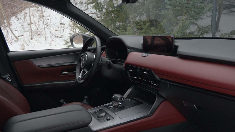 Inside, the CX-70 feels every bit the upscale SUV Mazda’s aiming for. Soft-touch materials, red Nappa leather, a stitched dashboard, and physical HVAC controls give it a luxury-lite appeal. The 12.3” infotainment screen isn’t a touchscreen in Canada (boo), but Mazda’s rotary dial is easy to use and ergonomically placed. Apple CarPlay and Android Auto are included, but also not touch-enabled here.